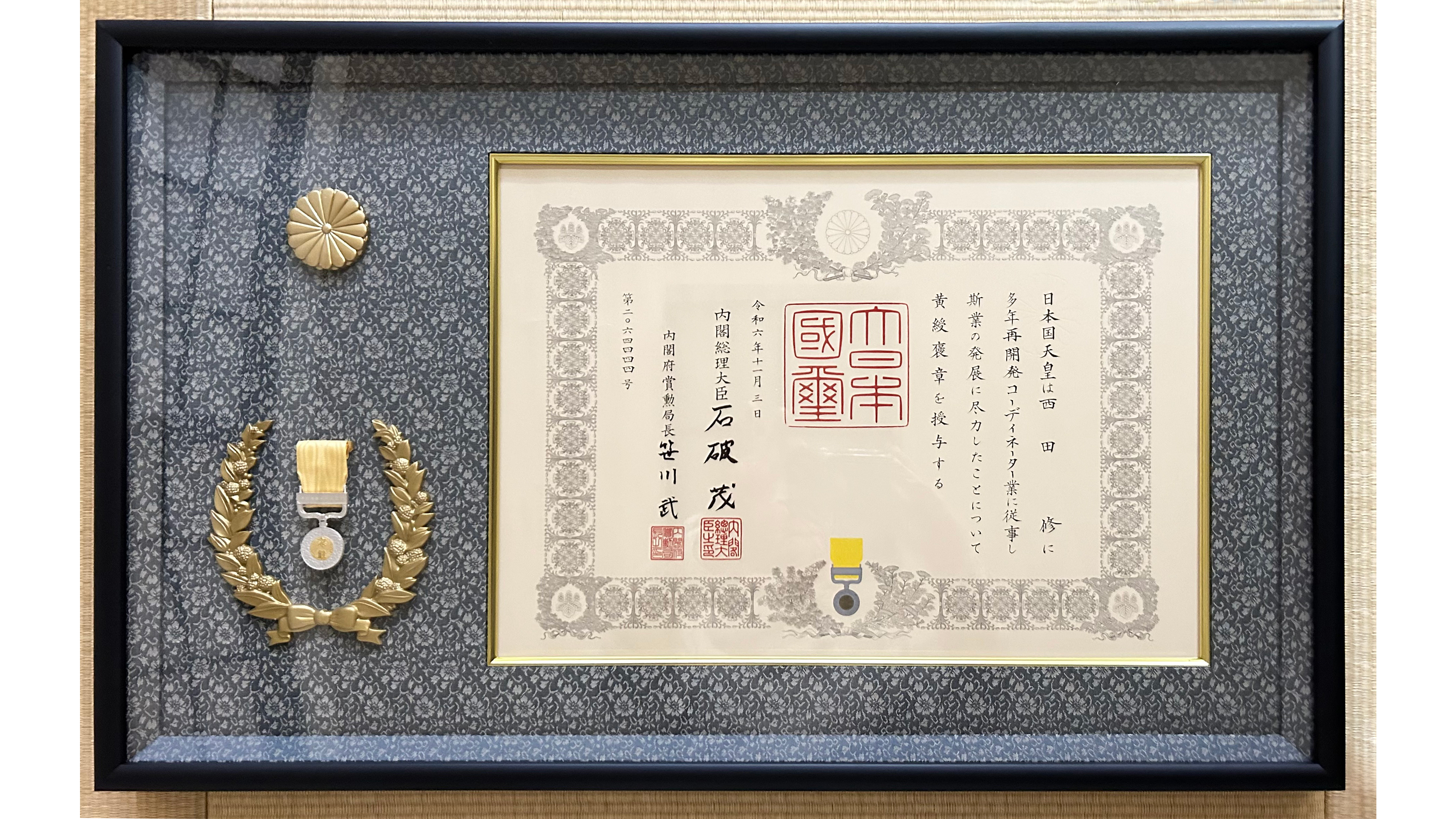 令和6年11月3日、当社最高顧問の西田修が秋の黄綬褒章を受章いたしました。